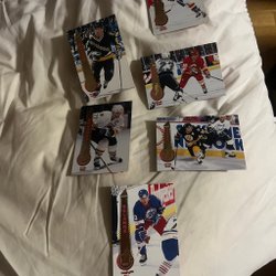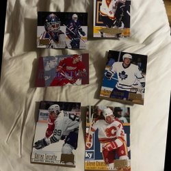 Samling av hockeykort med spelare som Radim Bicanek, Denis Pederson, Dominik Hasek, Nikolai Khabibulin, Janne Laukkanen, Brendan Shanahan, Steve Yzerman, Ed Jovanovski, Andrei Kovalenko och Adam Graves.
