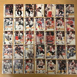 Hockeykort från Pro Set med spelare som Mike Hudson, Bobby Clarke, Thomas Steen och Dennis Vial.