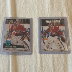 Ett urval av hockeykort med Patrick Roy. Korten visar Roy i både Colorado Avalanche och Montreal Canadiens tröjor. Dessa kort är från olika serier och utgivningsår.