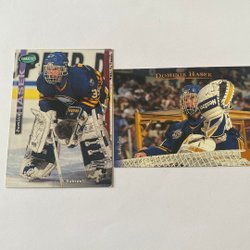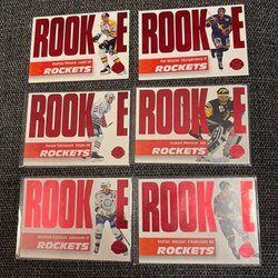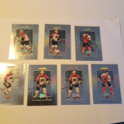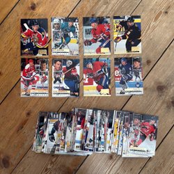 Ett parti med ishockeykort från olika år och serier. Korten visar spelare i aktion och porträtt.