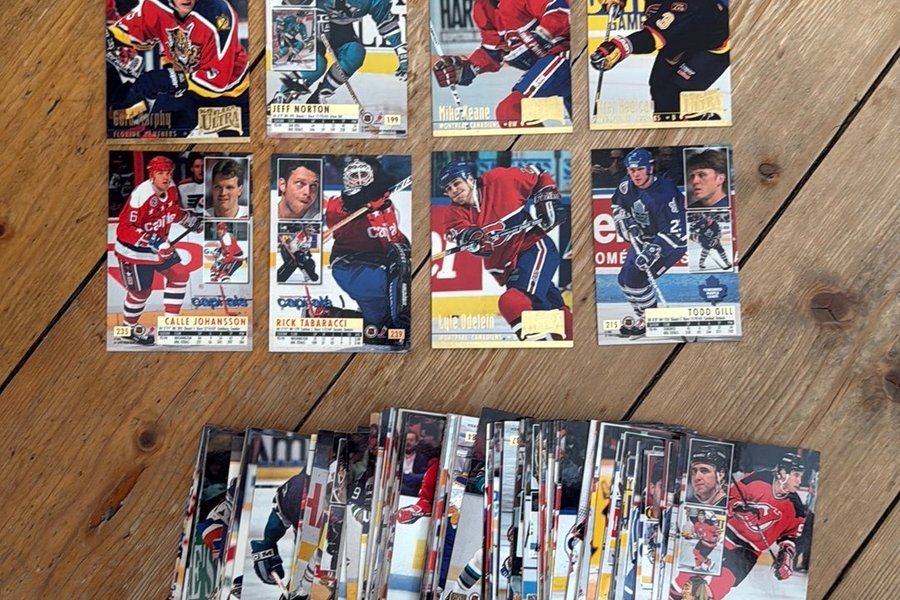 Ett parti ishockeykort med olika spelare som Jeff Norton, Mike Keane, Calle Johansson, Rick Tabaracci, Lyle Odelein, Todd Gill och Bernie Nicholls.