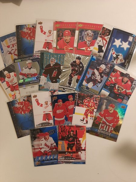 Ett parti med NHL-ishockeykort från Upper Deck, med spelare som Dylan Larkin, Alex DeBrincat, Aleksii Heponiemi, Zach Werenski, Adam Fantilli, Anton Lundell, Logan Stankoven och Jaccob Slavin. Korten inkluderar olika serier som Canvas, Credentials, Dazzlers, Debut Ticket Access, Cup Quest, och Superstar.