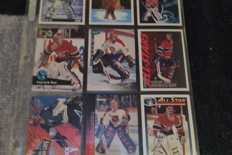 Nio hockeykort med Patrick Roy. Korten inkluderar olika utgåvor som "Franchise", "All-Stars", "Second Team All-Stars" och "All Star Game".
