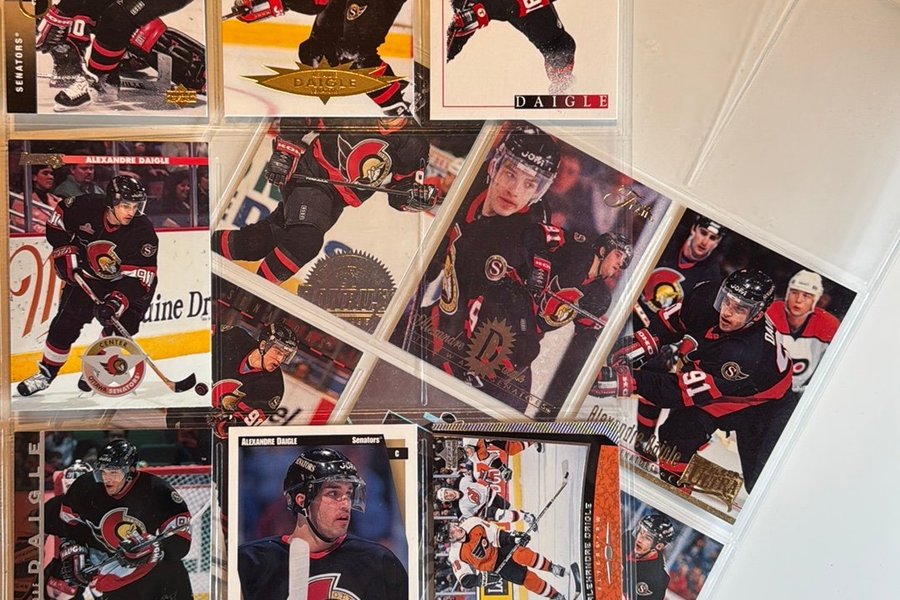 Ett urval av Alexandre Daigle ishockeysamlarbilder. Korten visar Daigle i olika matchsituationer och porträtt, främst i Ottawa Senators-tröjan.