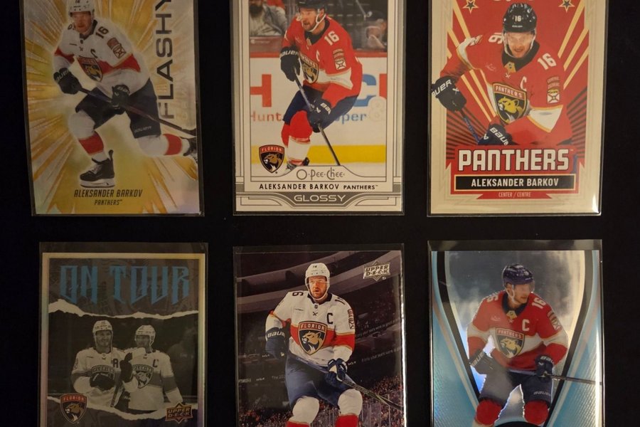 6 kort med Aleksander Barkov från Florida Panthers. Korten inkluderar olika utgåvor som "Flashy forward", "Glossy", "Allure" och O-Pee-Chee Retro.