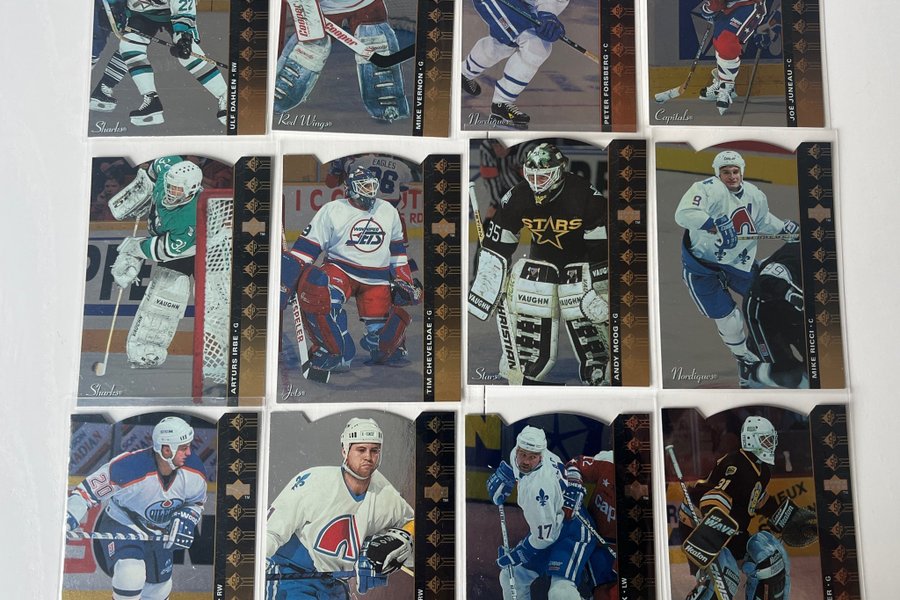 12 kort från 1994-95 Upper Deck SP Diecut. Korten inkluderar spelare som Ulf Dahlen, Mike Vernon, Peter Forsberg, Arturs Irbe