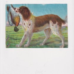 Ett stort antikt kvadratiskt bokmärke föreställande en hund som bär en fågel i munnen. (2597) Höjd 12,5 cm. Porto 20 kronor.
