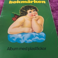 En gammal skrivbok (i dåligt skick) med uppemot 200 inklistrade märken. De minsta ej räknade. Höjd på boken 20,5 cm. Porto 30 kronor.