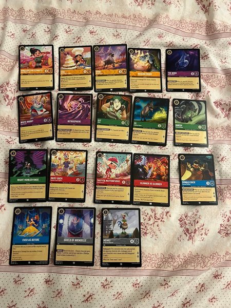 Blandat med kort från spelet Lorcana