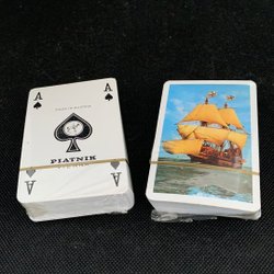 Spelkort med motiv av en kung i hjärter. Korten är vita med rött, svart och gult mönster.