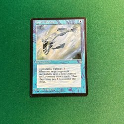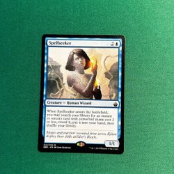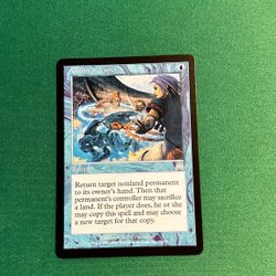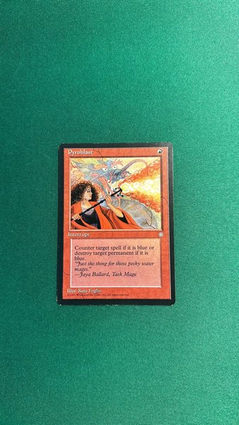 Kortet "Pyroblast" från Magic the Gathering. Kortet är av typen "Interrupt" och har förmågan att kontra en blå trollformel eller förstöra en blå permanent. Illustrationen är gjord av Kaja Foglio.