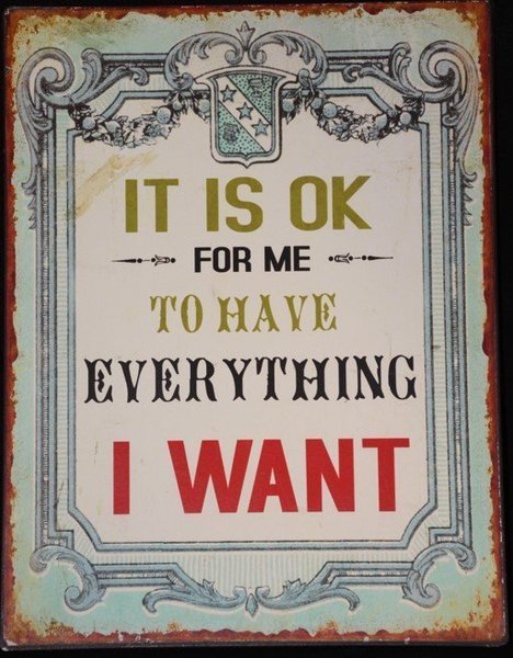 IT IS OK FOR ME TO HAVE EVERYTHING I WANT skylt i s k Chabby Chic, ca 26,5x35 cm