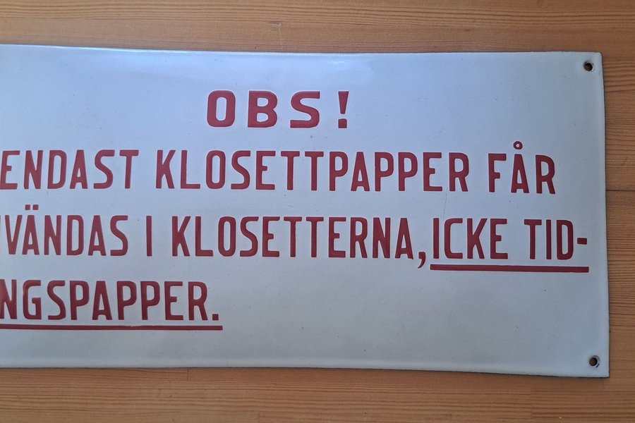 Emaljerad skylt med texten: OBS! Endast toalettpapper får användas i toaletterna, icke tidningspapper.