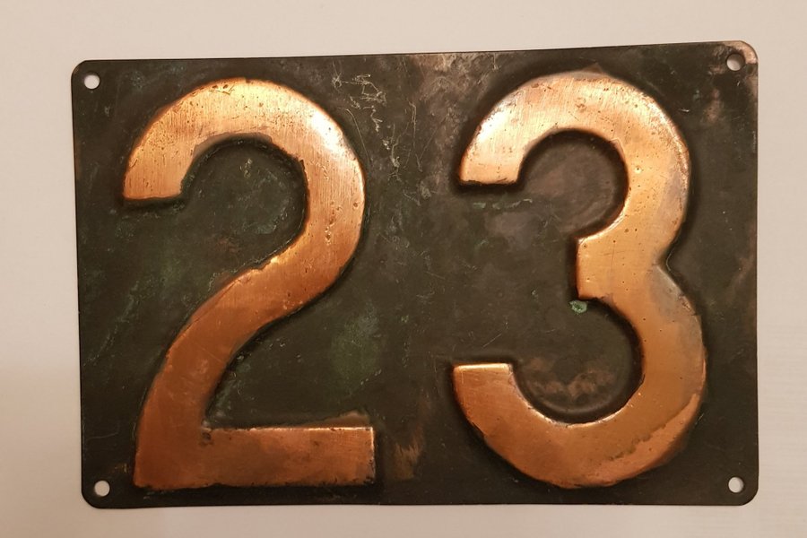 Nummer 23 husnummerskylt i patinerad Koppar. Suttit ute i många år. Vikt 150 gram