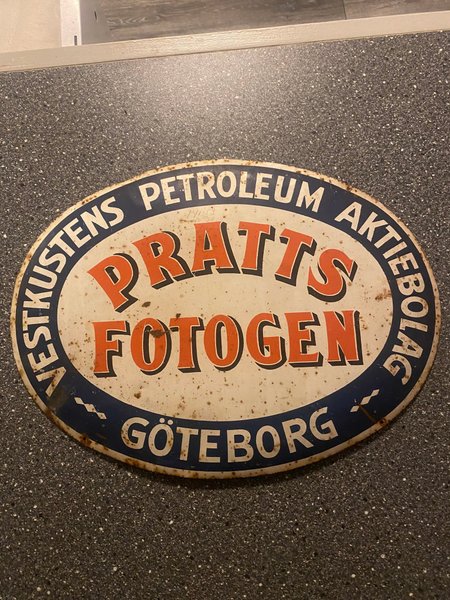 Kupad och oval skylt i litograferad plåt. Motivet är röd och vit text ”PRATTS FOTOGEN VESTKUSTENS PETROLEUM AKTIEBOLAG GÖTEBORG” mot blå och vit bakgrund. Måtten är 380 x 280 mm. Skylten tillverkades under 1920-talet.