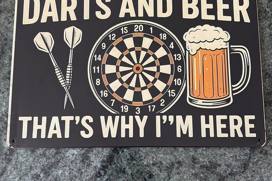 Dekorativ skylt med texten ”DARTS AND BEER THAT'S WHY I'M HERE”.
