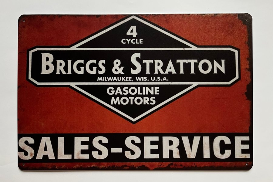 En Briggs & Stratton skylt med texten ”4 Cycle”, ”Briggs & Stratton Milwaukee, Wis. U.S.A.”, ”Gasoline Motors” och ”Sales-Service”.