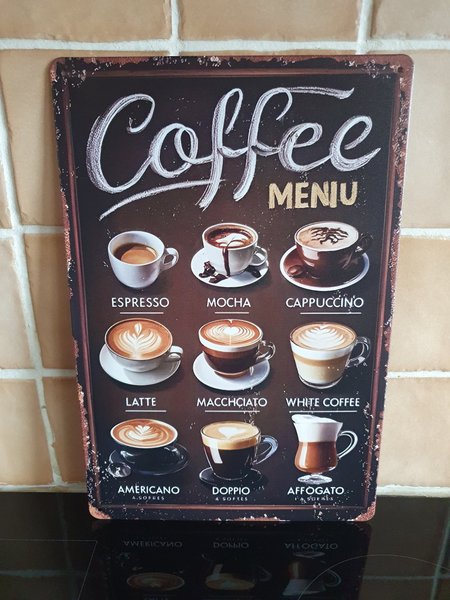 Plåtdkylt coffee meny.Tavlan har hål i hörnen för upphängning.