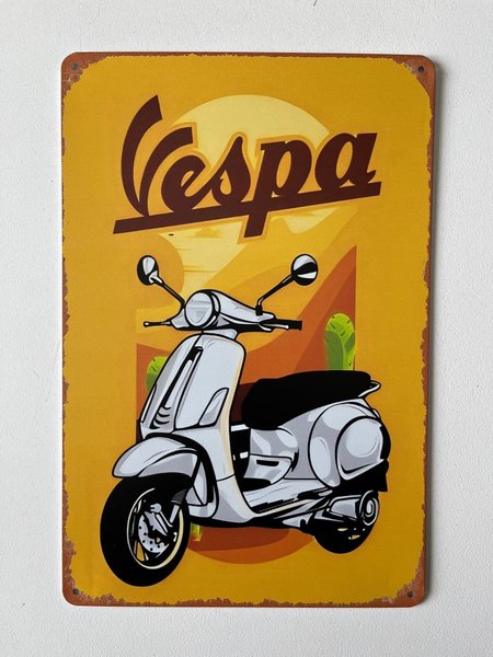 En dekorativ plåtskylt med motiv av en Vespa. Perfekt för den som gillar retrostil och fordon.