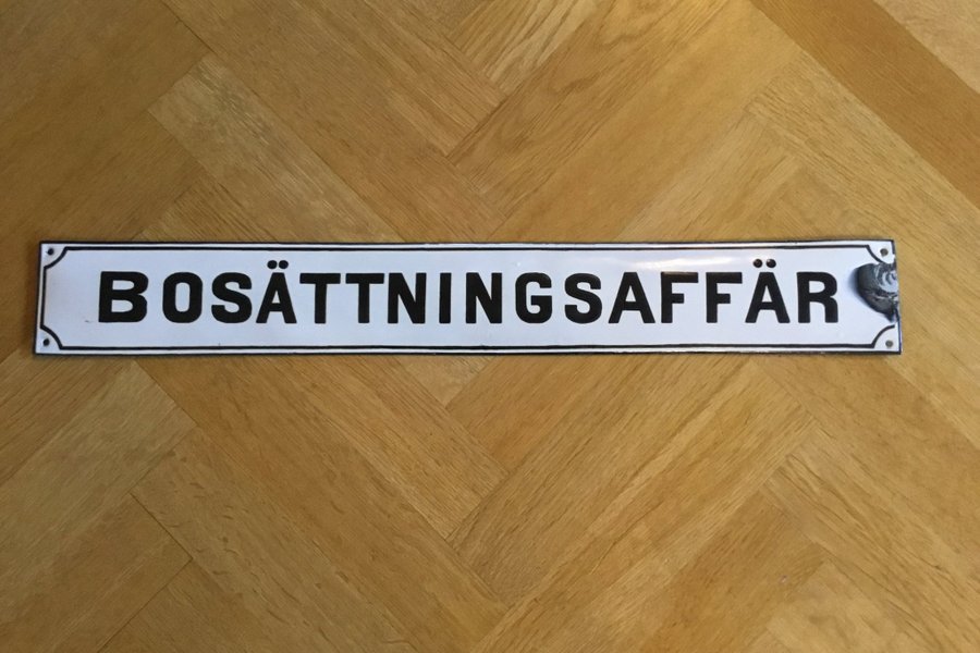 Antik emaljerad skylt "Bosättningsaffär" i gott skick men med skada på högra sidan, tyvärr. Storlek: 60 x 8 cm.