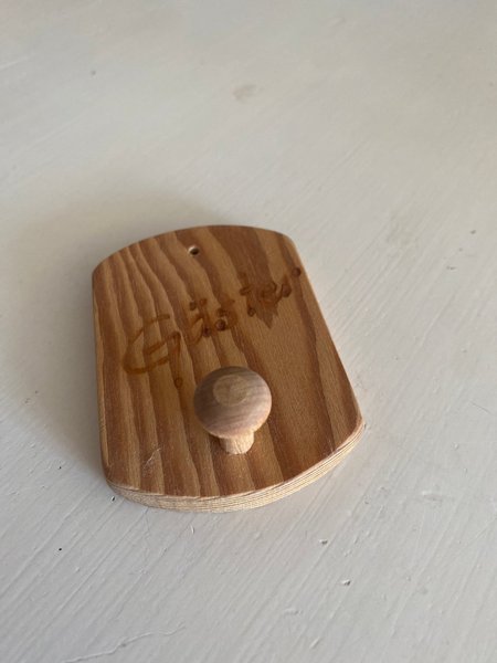 Träskylt med texten "Gäster” och en liten träknopp. Skylten har ett förborrat hål för upphängning.