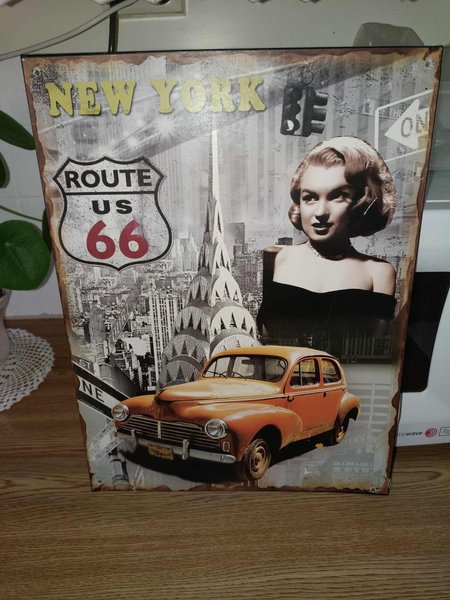 Dekorativ plåtskylt med motiv av New York, Route 66, Marilyn Monroe och en bil. 30x40cm