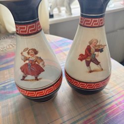 Två plåtskyltar med Cinzano-motiv. En skylt visar en kvinna med vindruvor och en flaska, texten ”DRY. EXTRA DRY. BRUT” finns nedtill. Den andra skylten visar en figur med en flaska och ett glas, omgiven av flaggor, med texten ”VERMOUTH TORINO” nedtill.