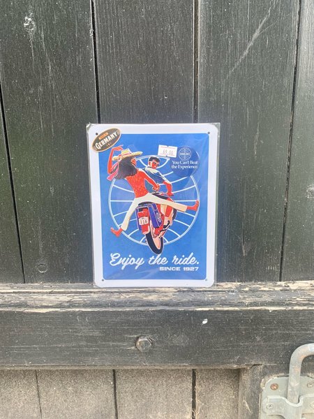 Metalskilt 15x20cm med et motiv af en person på en scooter. Skiltet er blåt med hvid skrift, hvorpå der står "Enjoy the ride. Since 1927". Der er også et "Made in Germany"-mærke på skiltet.