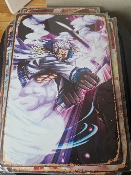 Plåtskylt med motiv från One Piece. Skylten har hål i hörnen för enkel upphängning.