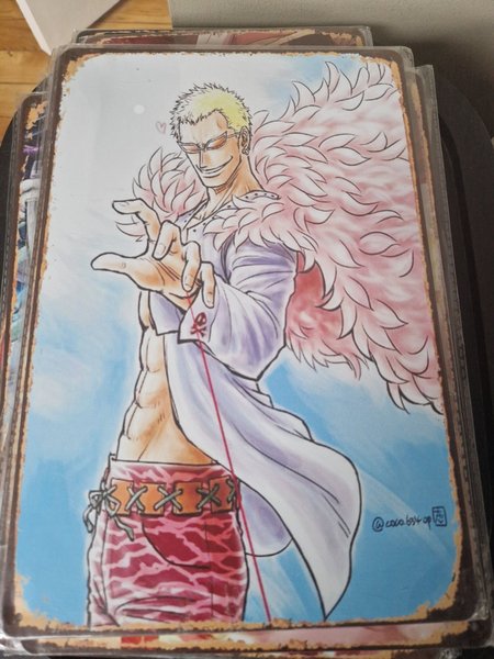 Plåtskylt med motiv från One Piece. Skylten har hål i hörnen för enkel upphängning.