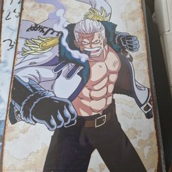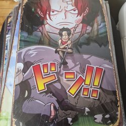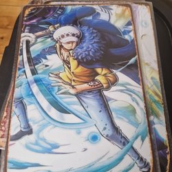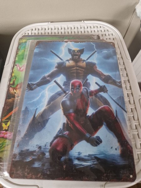 Plåtskylt med motiv av Deadpool. Skylten har hål i hörnen för enkel upphängning.