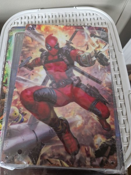 Plåtskylt med motiv av Deadpool. Skylten har hål i hörnen för enkel upphängning.