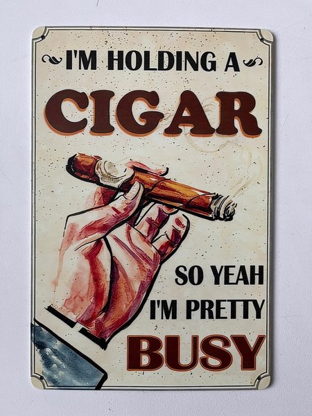 Dekorativ plåtskylt med texten ”I'm holding a cigar so yeah I'm pretty busy”.