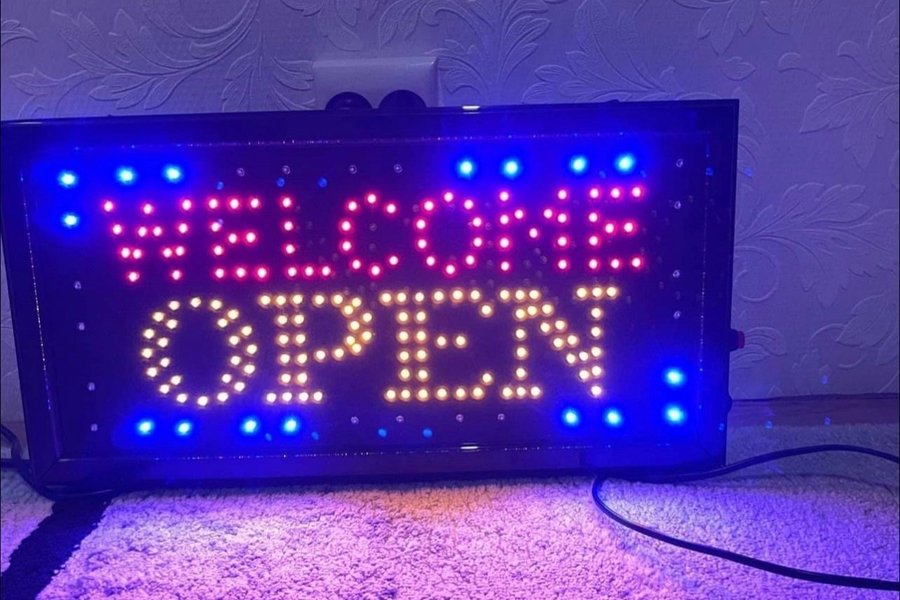 LED-skylt med texten "WELCOME OPEN". Skylten har röda, gula och blåa LED-lampor som lyser upp texten. Den är rektangulär och har en svart ram. En strömkabel är ansluten till skylten.