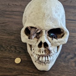 Cool sparbössa i form av en döskalle men en gnagare och ett flygfä i ögonhålorna.