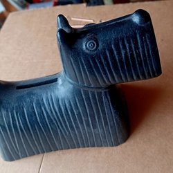 En charmig sparbössa formad som en hund, tillverkad i keramik. Den har ett dekorativt mönster på ryggen och en öppning för mynt på baksidan av huvudet. Botten har en gummipropp för enkel tömning.