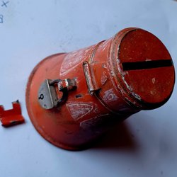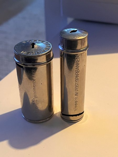 Två sparbössor i metall. Den ena är märkt "Sätt kronan på verket" och den andra "Tömmes av Postsparbanken".