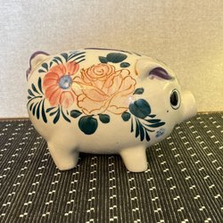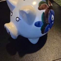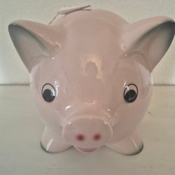 Spargris i keramik, formad som en gris med blå ögon och en röd sigill med ett dollartecken.
