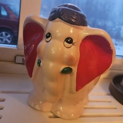 Föremålet på bilden är en klassisk spargris i glaserad keramik eller porslin, som med stor sannolikhet kommer från den svenska tillverkaren Guldkroken i Hjo. Dessa figurer kännetecknas ofta av sin vita glasyr och handmålade blomsterdekorationer på ryggen