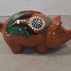 En charmig spargris i keramik i fin brun färg med blommönster runt om.