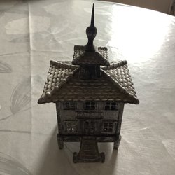 En spargris i metall. Den har en öppning på toppen för att sätta in mynt.