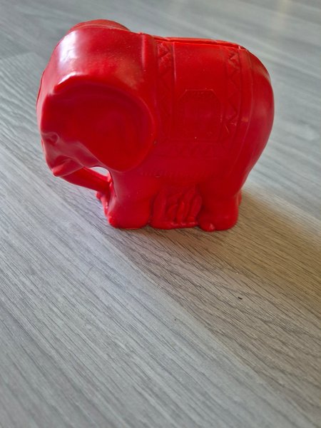 En söt röd spargris i form av en elefant. Perfekt för att spara pengar på ett roligt sätt. Nyckel saknas och det finns någon peng i.