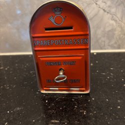 Retro sparbössa i plåt. Mysig att ha på en hylla eller i sina gömmor. Lätt att öppna & stänga Höjd 15,5 cm, diameter 11 cm.