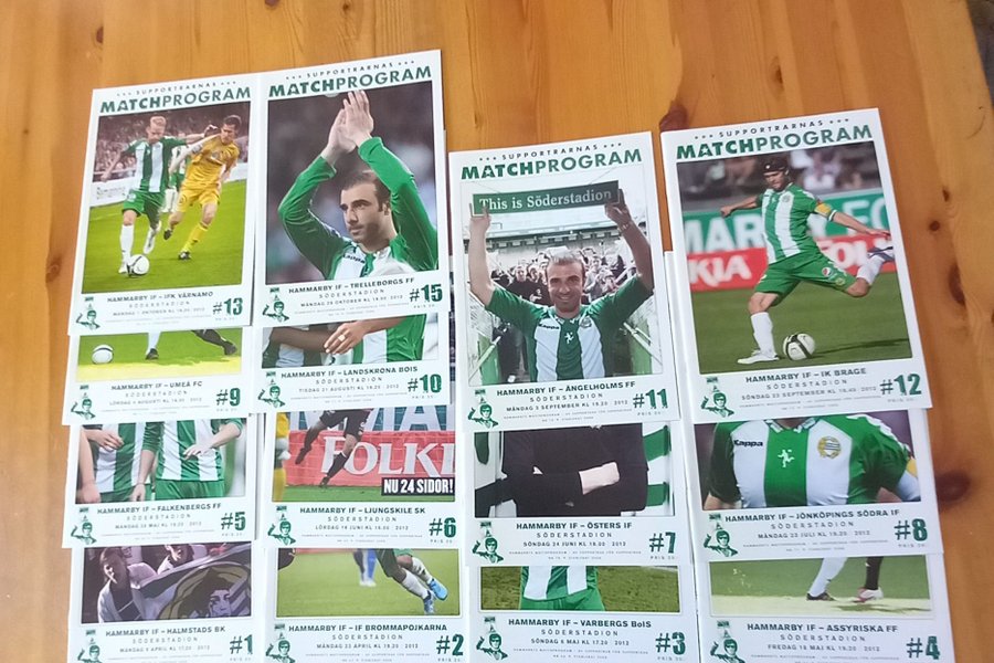 Matchprogram från Hammarby IF:s matcher,2012 nr 14 saknas. Samlingen inkluderar program från matcher mot IFK Värnamo, Trelleborgs FF, Umeå FC, Landskrona BoIS, Ängelholms FF, IK Brage, Falkenbergs FF, Ljungskile SK, Östers IF, Jönköpings Södra IF, Halmstads BK, IF Brommapojkarna, Varbergs BoIS och Assyriska.