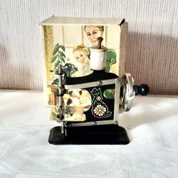 SINGER symaskin i svart och silver. Maskinen har en vev på sidan och är märkt "SINGER" samt "THE SINGER MFG. CO. U.S.A.".bCa 16x16 cm. Skick, se bilder