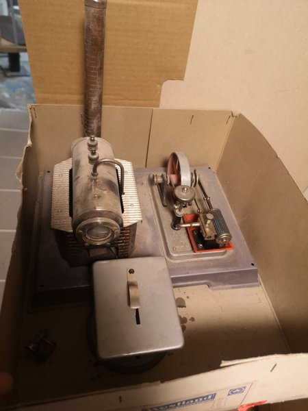 Ångmaskin med skorsten och svänghjul. Inkluderar en separat metallåda.
