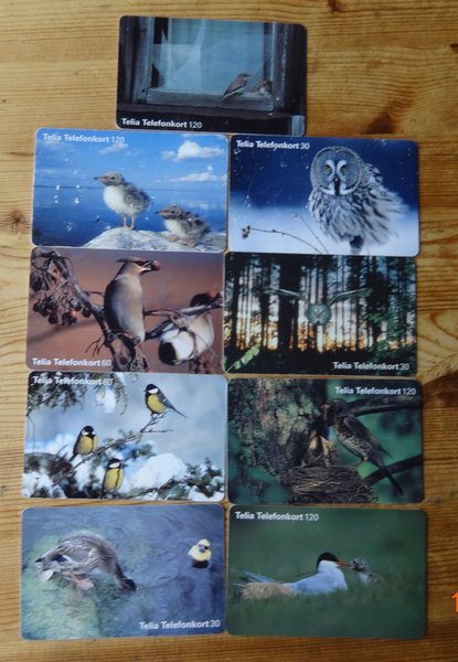 9 stycken fåglar på telefonkort från Telias logga, äkta vara för samlare