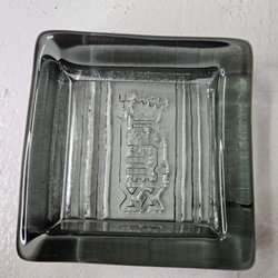 Askfat i glas troligtvis Viktor Vicke Lindstrand askfat, ca 14 cm, gott skick,färgen är svår att säga em jag tycker den går i mörkbrun,mörklila,mörkröd