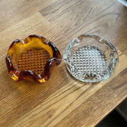 Två askfat i glas. Ett askfat har en blomliknande form och det andra har ett mönster med trianglar.
