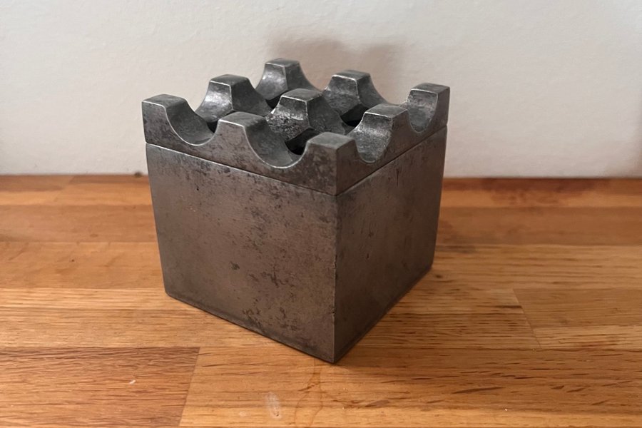 Fyrkantig askkopp i metall. Askkoppen har en robust design och är tillverkad av metall. Den har skåror på ovansidan för att hålla cigaretter.